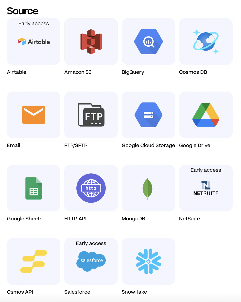 As you probably guessed, a source is where data comes from, whether it's a data warehouse like BigQuery, a file storage service such as Google Drive, or a CRM like HubSpot. Data needs to be pulled from a source, transformed to fit your destination's schema, and ingested into the system to be usable.